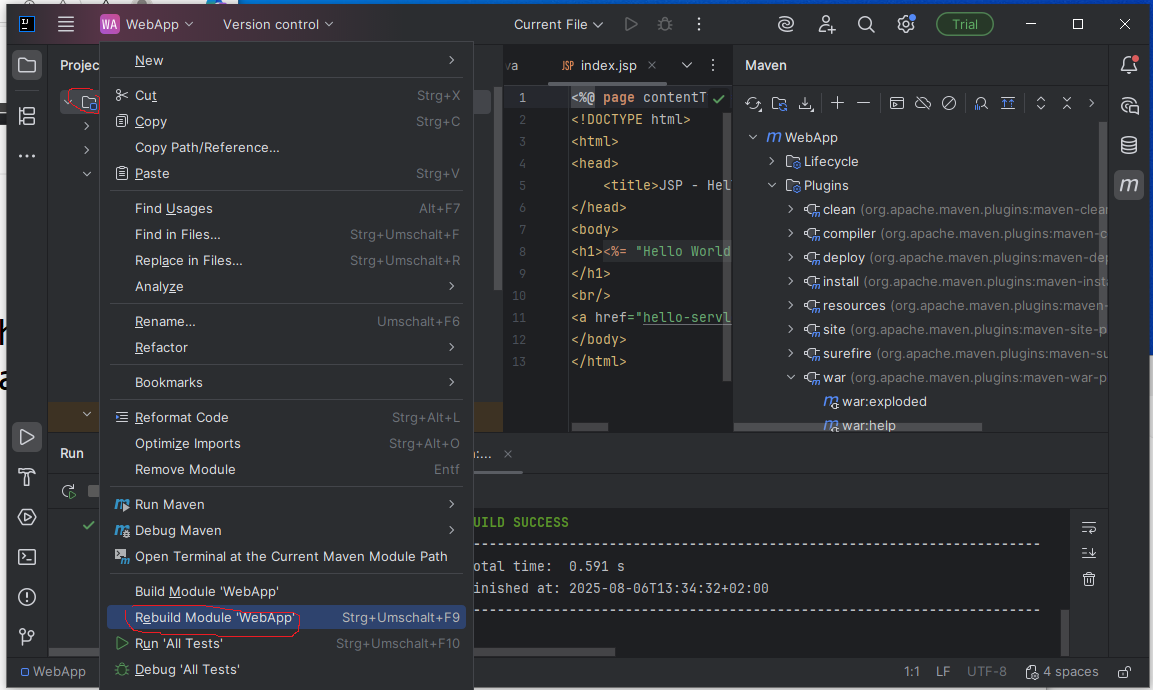 .war-Datei erstellen.war-Archiv erscheint imtarget/-Verzeichnis des Projekts- ggf. auch explizit einen Rebuild des Projekts auslösen